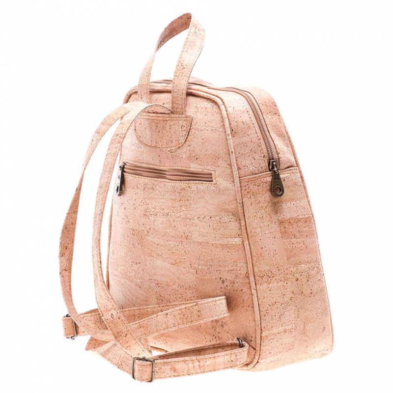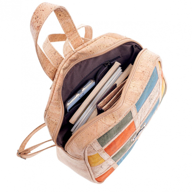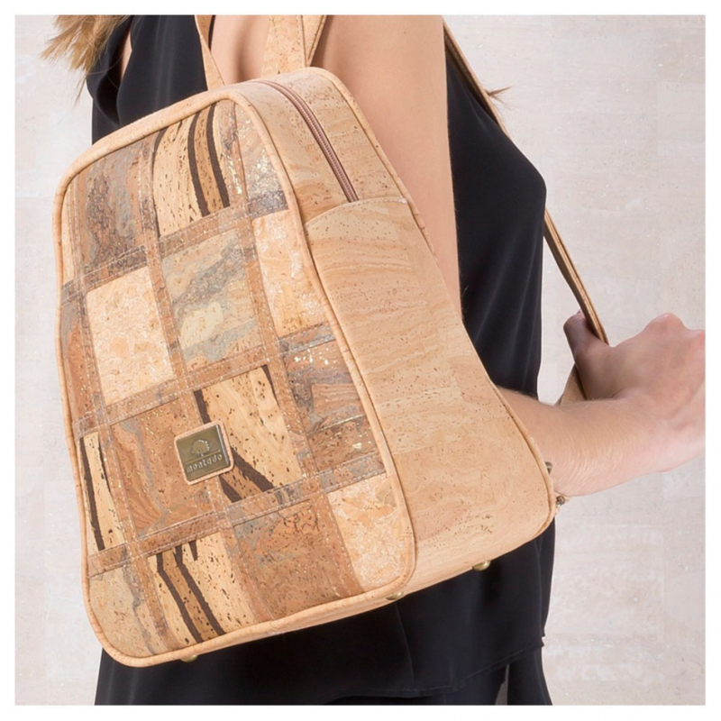 Vegan cork backpack with patchwork pattern on the front. Inside there is a mobile phone pocket and a zipper. It has a hand strap and two adjustable shoulder straps in size. It also has a pocket with a clasp at the back. In the confection of this suitcase no animal material was used.