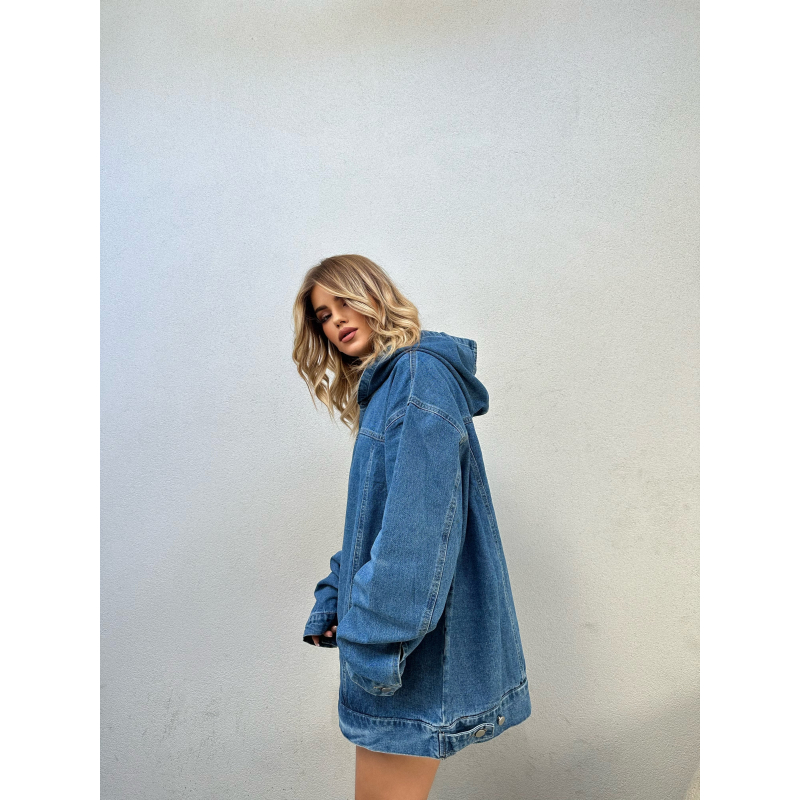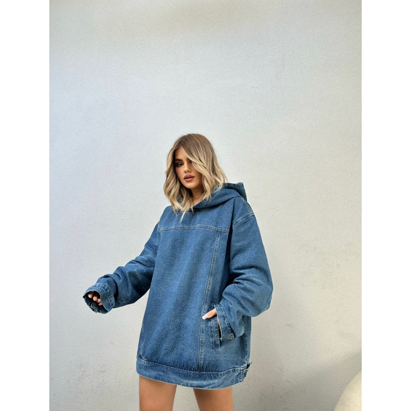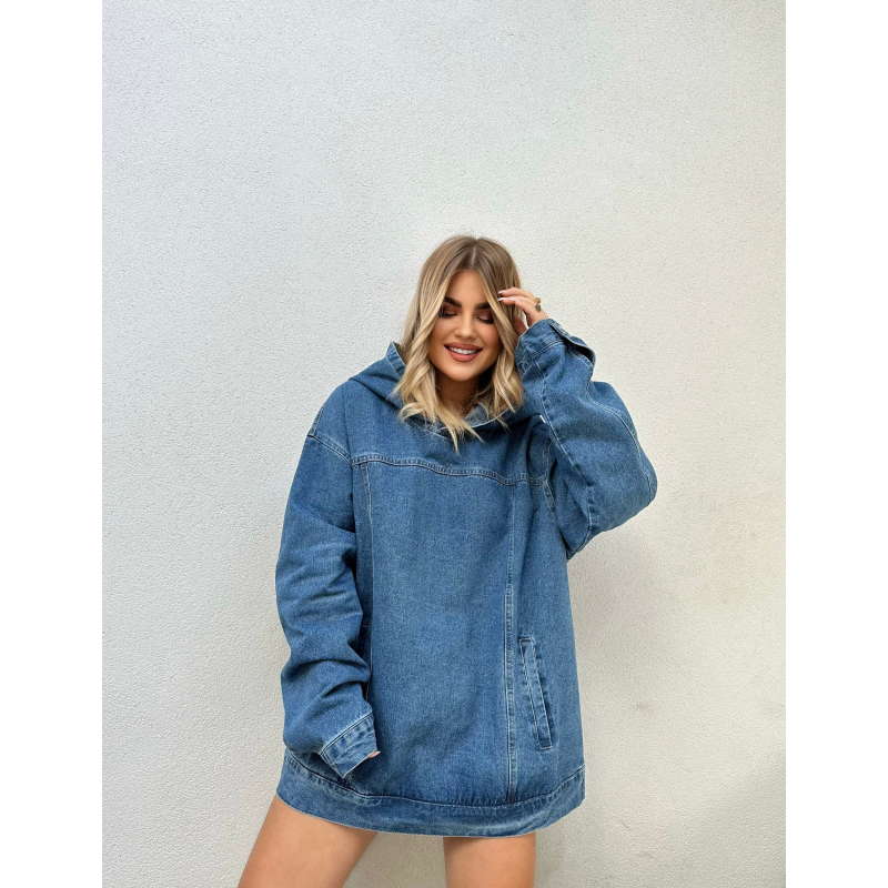 Hoodie stil oversize me kapuc. Bluza vjen me xhepa ne pjesen e perparme. Material xhins.