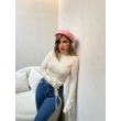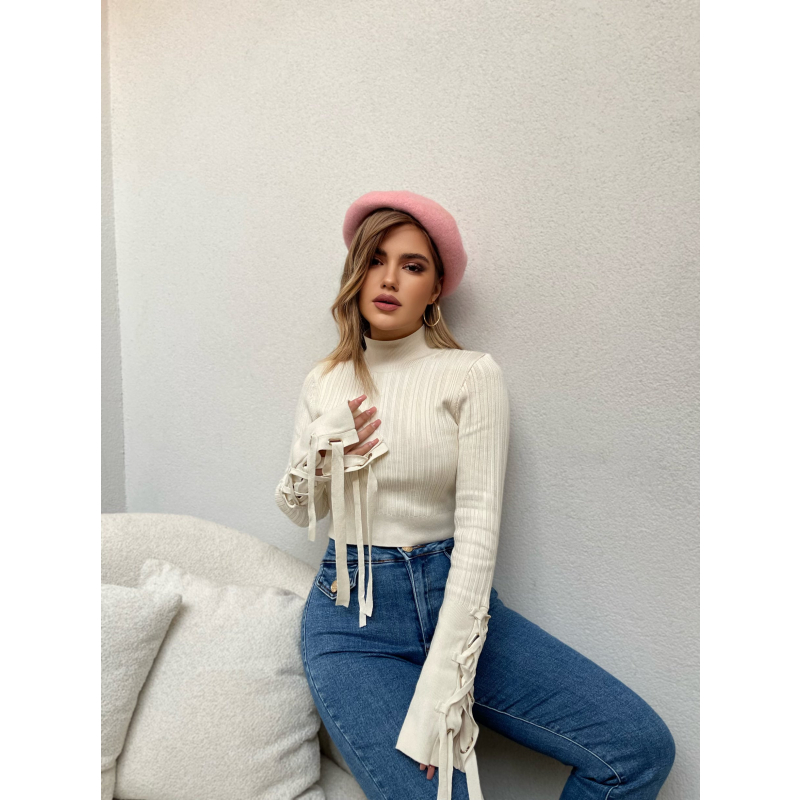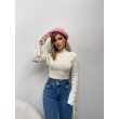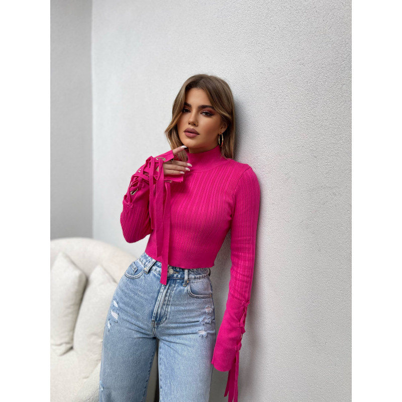 Bluze golf me lidhse ne pjesen e mengeve. Eshte me damar. Pulovra ka gjatesi normale. Modeli vjen ne dy ngjyra: i bardhe dhe pink.