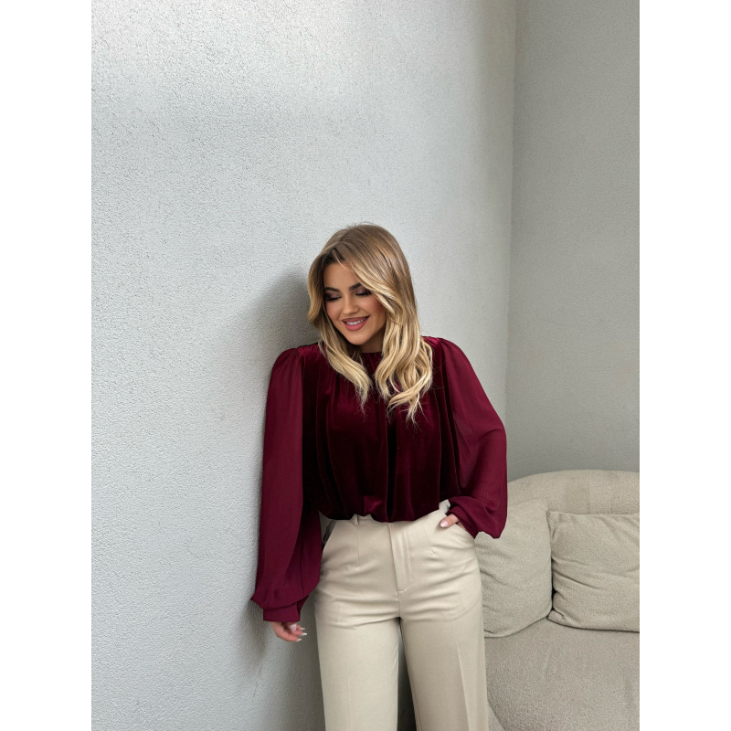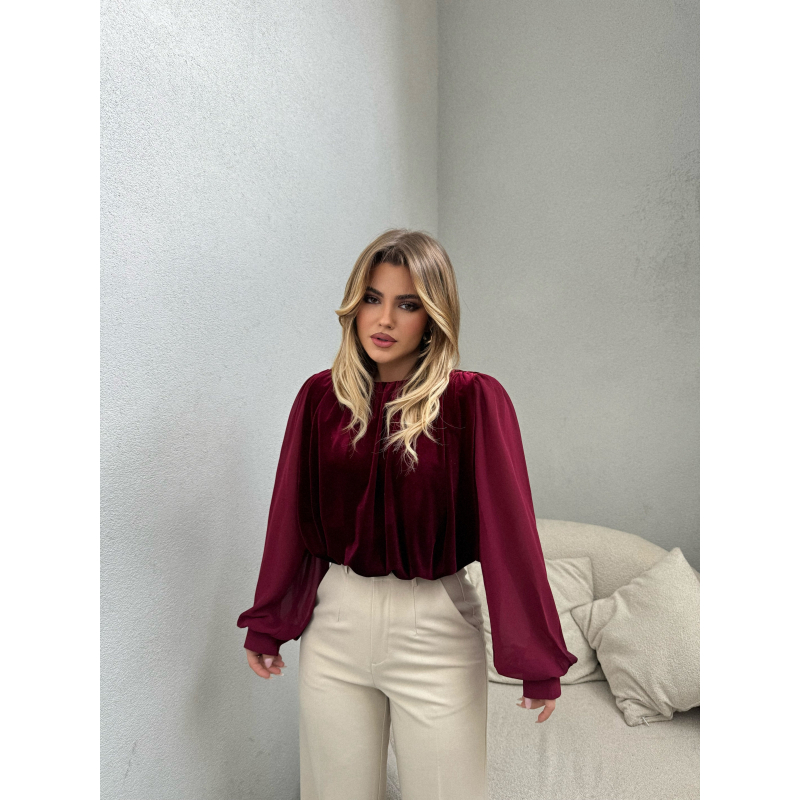 Bluze velvet me menget tyl. Eshte me llastik ne fund. Jake rrethore. Teper stil dhe lehtesisht e kombinueshme.