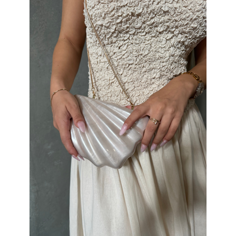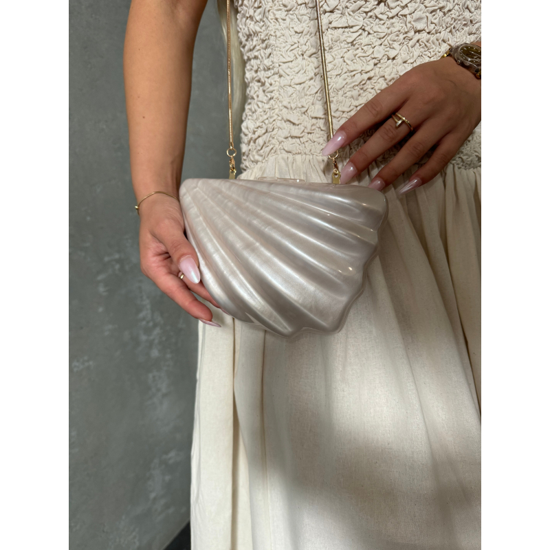 Cante e vogel ne forme guaske, me efekt perlash dhe rrip te holle zinxhir. Elegante dhe unike, perfekte per raste speciale.
