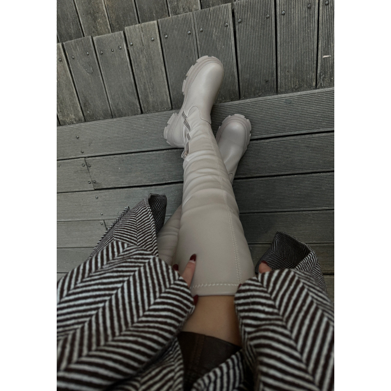 Cizme te gjata. Vijne siper gjurit. Material lekure. Mbyllen me zinxhir ne ane.