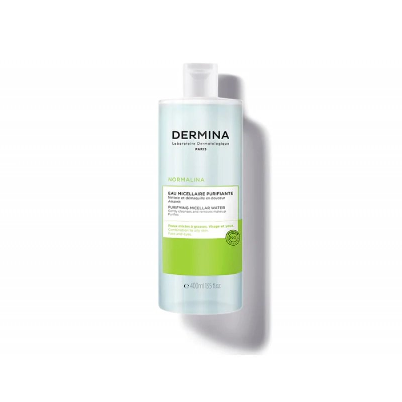 Uji Micellar Purifying DERMINA heq grimin dhe pastron lëkurën e kombinuar në yndyrë, duke ruajtur me ekuilibrin e saj fiziologjik. Falë micelave të formuluara posaçërisht që sigurojnë veprim të butë dhe efektiv pastrimi, eliminon papastërtitë, duke përfshirë produktet waterproof dhe sebumin e tepërt pa e tharë lëkurën. Ky ujë pastrues përmban një kombinim të përbërësve aktivë pastrues (sulfat zinku, ekstrakt i algave të detit, kompleks fito-aktiv dhe kripë bakri) për të pakësuar sebumin e tepërt dhe për të ndihmuar në reduktimin e papërsosmërive. Lëkura ndihet menjëherë e pastruar, e freskët dhe e pastër.