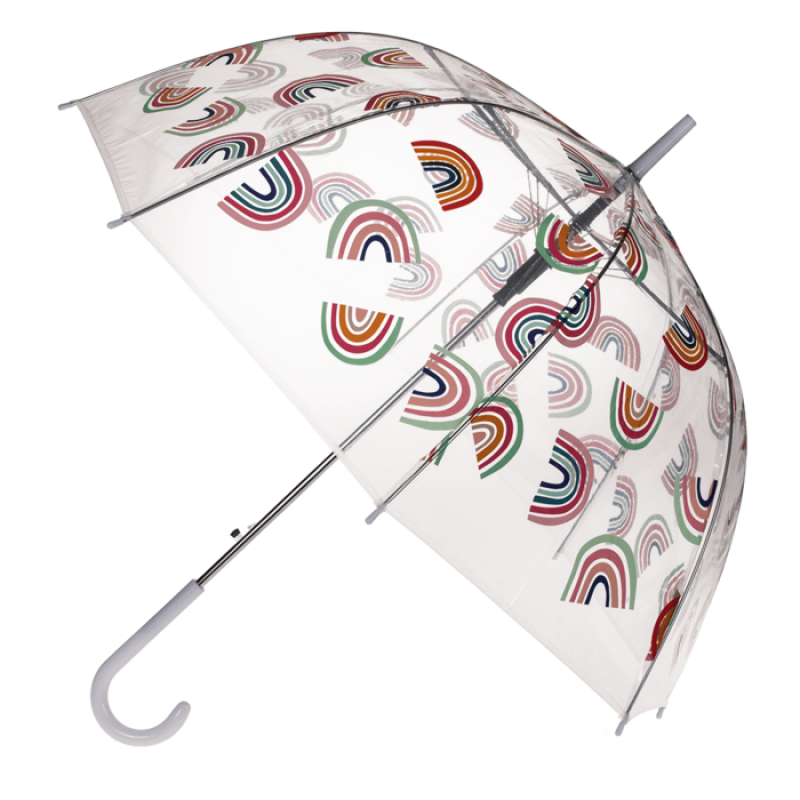 Ecni jashtë në një ditë me shi, pa u shqetësuar nëse mund të lageni shoqëruar gjithmonë nga një çadër transparente me dizajnin e ylberit.