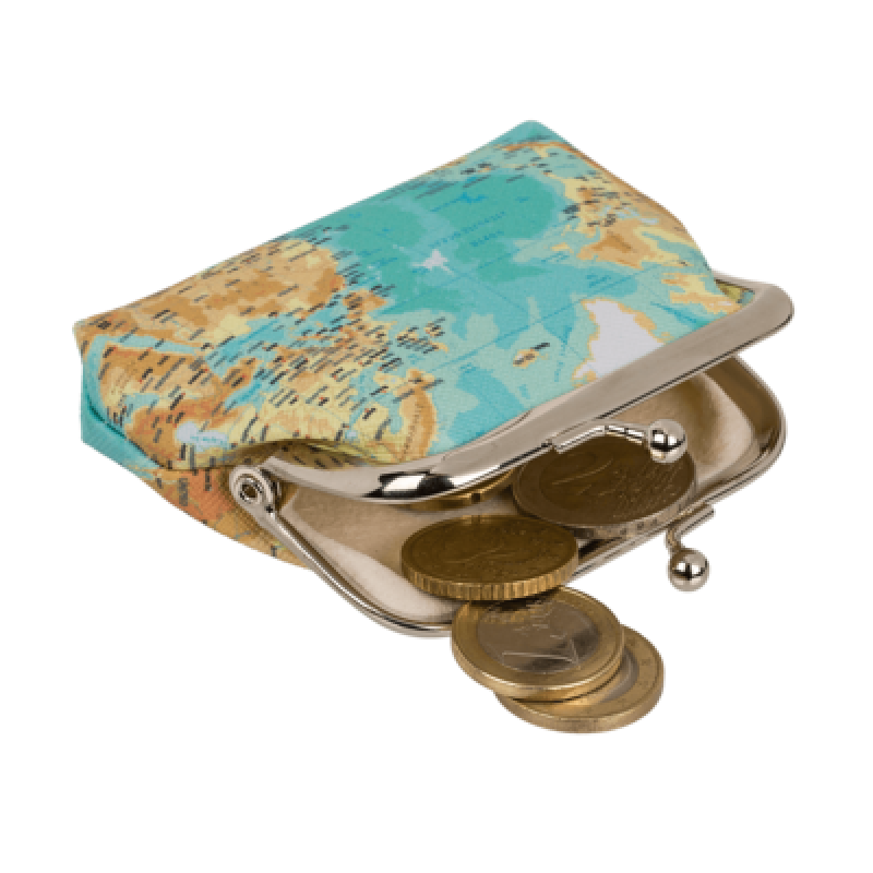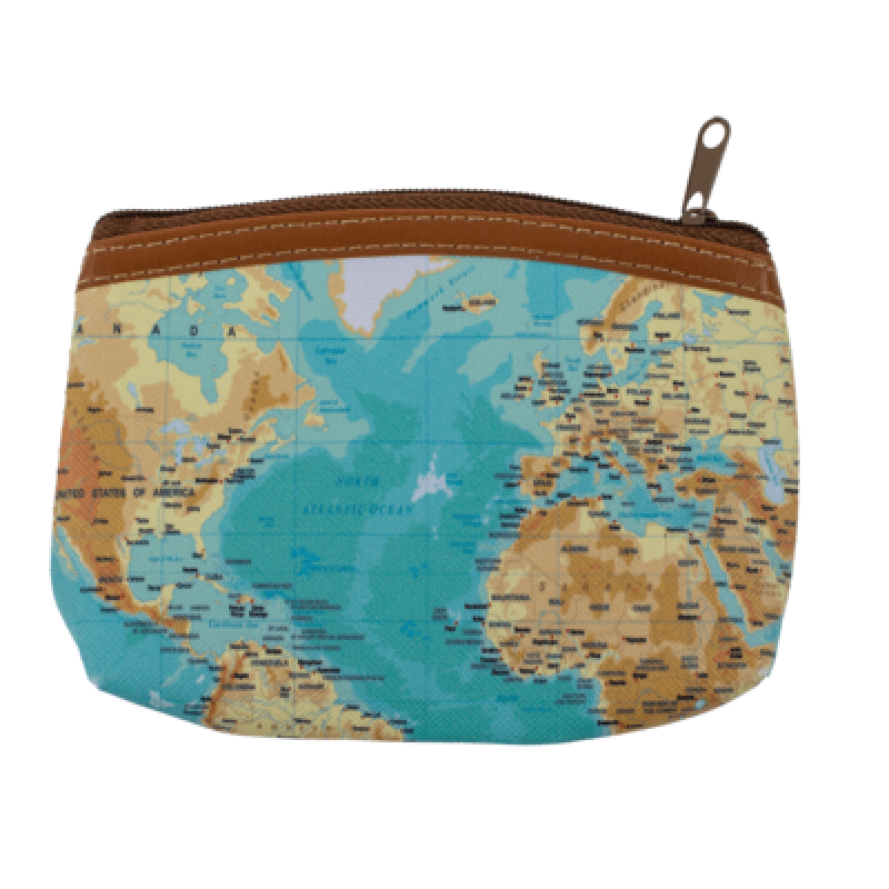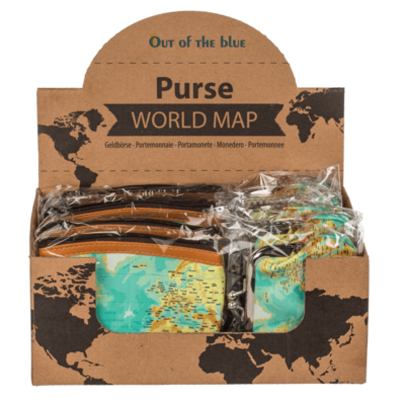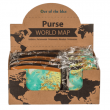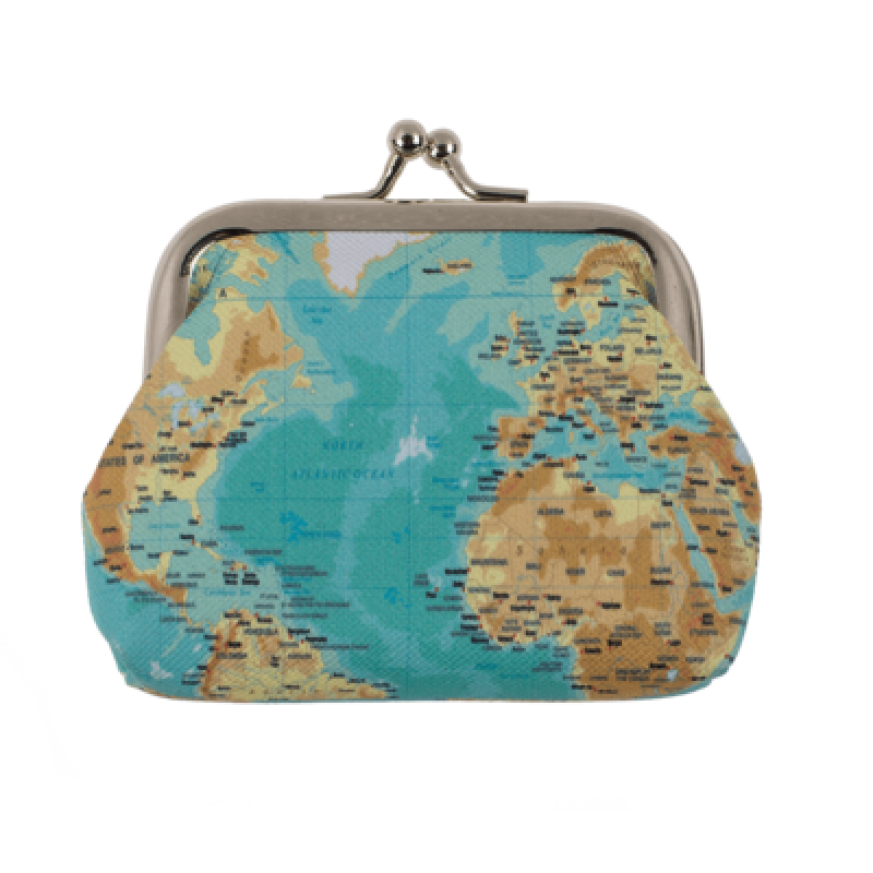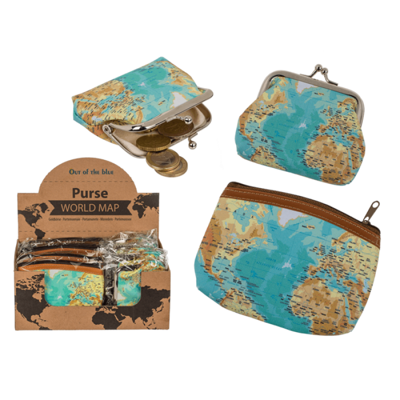 Portofol fantastik për ruajtjen e monedhave me dizajnin e hartës së botës, e disponueshme në dy modele: me zinxhir dhe me kapje metalike. Vjen në përmasat: