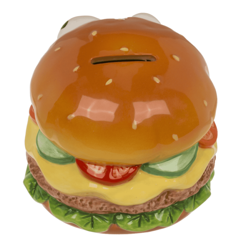 Arkë kursimi me çelës në formë burger Materiali: qeramike Permasat: 12 x 11 cm Vjen me mekanizmin me çelës