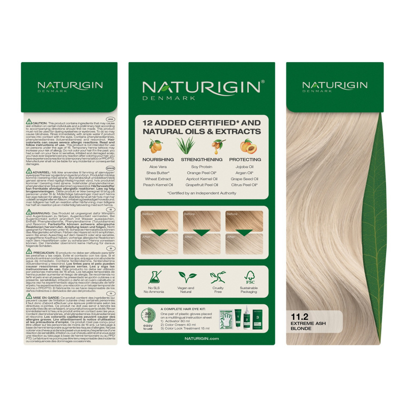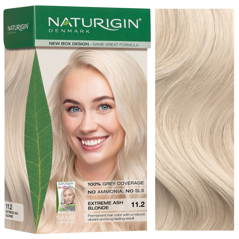 Extreme Ash Blonde 11.2 i jep flokëve një ngjyrë bjonde ekstrem në të hirtë. Mundt të përdoret edhe si highlight. Një formulë e avancuar me përzierje unike të vajrave esencialë organikë të çertifikuar. Kombinimi i vajit të limonit, portokallit si dhe 10 ekstrakteve të tjerë organikë, mbrojnë dhe ushqejnë flokët gjatë lyerjes. Me NATURIGIN ju nuk do të realizoni vetëm ngjyrën tuaj, por flokët do t’i keni plot shkëlqim dhe të buta si mëndafshi. Kjo bojë flokësh është plotësisht pa amoniak, pa parabenë dhe pa SLS dhe mbulon 100% thinjat.