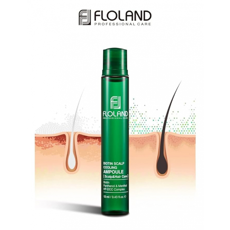 Floland Biotin Scalp Cooling Ampoule – trajtim intensiv me efekt freskues për flokët dhe skalpin e kokës, që i lë flokët të butë dhe me shkëlqim. Formula është e pasuruar me përbërës bimorë që forcojnë flokët dhe u japin më shumë volum.