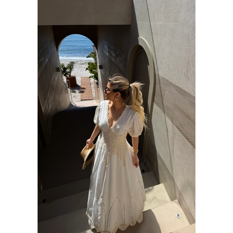 Fustan i bardhe. Fustan i gjate, me krahe te shkurter dhe jake V. Prerje e lirshme, ka super detaje te dandelles se punuar bukur ngjyre pane.