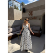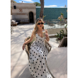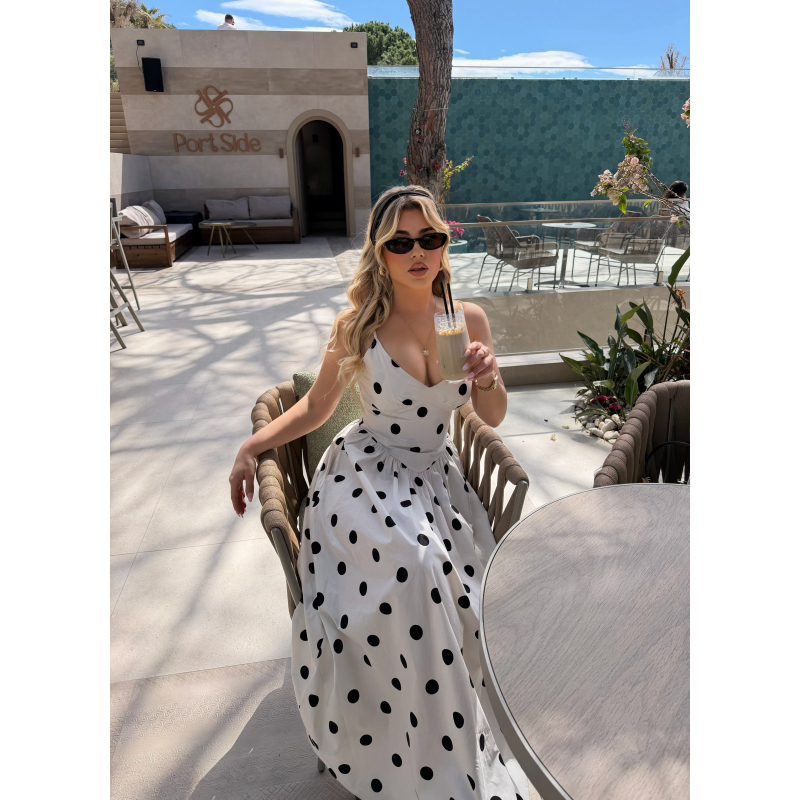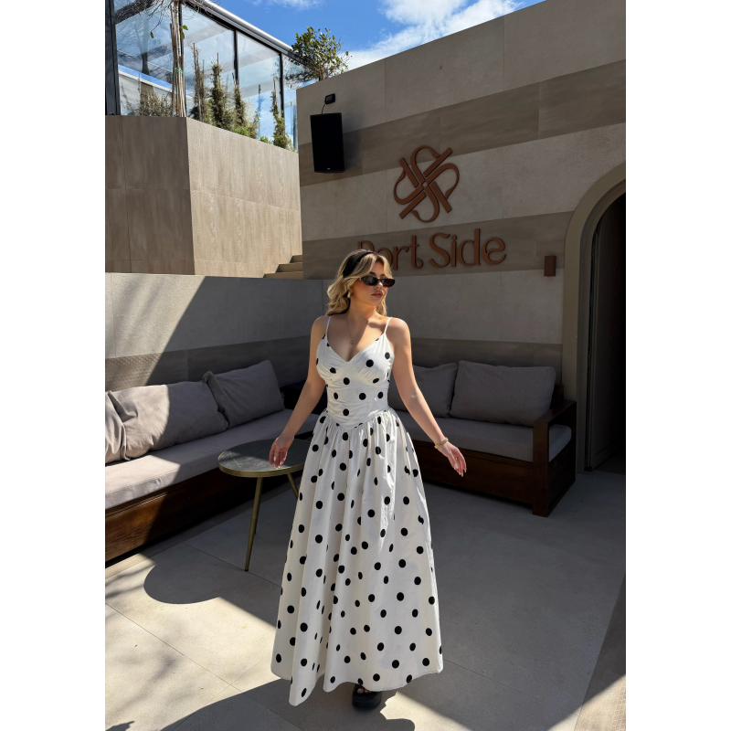 Fustan i bardhe me pika. Fustan i gjate, busti eshte kanatiere prerje moderne. Material fantastik i fresket dhe copa me IN e momentit polka dots.