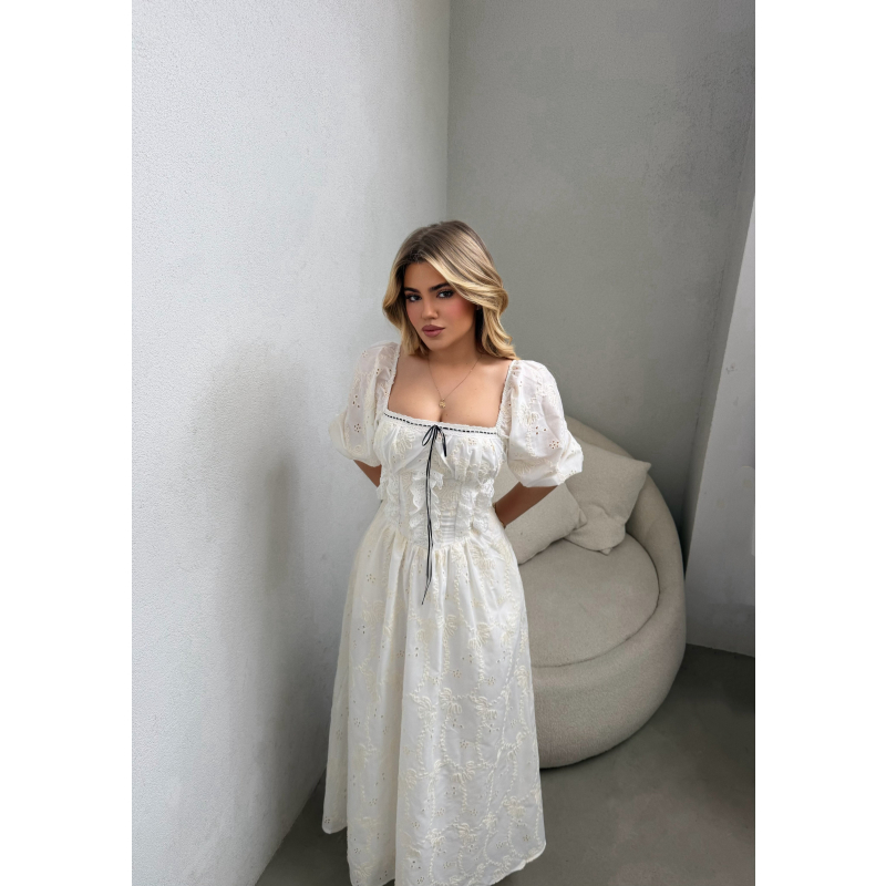 Fustan me lule te qendisura. Detaj te vecante ka nje fjongo te zeze tek pjesa e bustit. I lehte dhe i rehatshem.