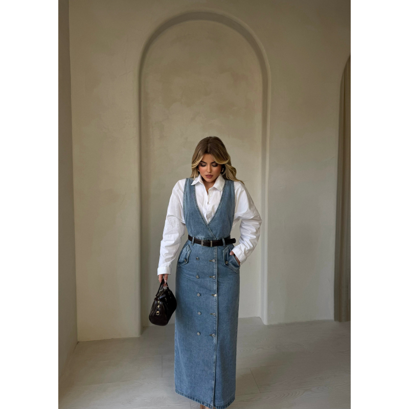 Fustan xhins me stil modern dhe dekolte V qe duket shume bukur veshur. Ka detaje me kopsa dhe xhepa, perfekt per nje look casual.