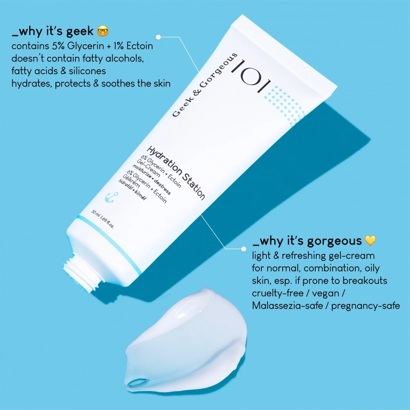 Geek and Gorgeous – Hydration Station është një hidratues xhel-krem i lehtë dhe freskues. Ai është dizajnuar për lëkurë normale, të kombinuar dhe të yndyrshme. Formula e tij jo vetëm që hidraton, por gjithashtu qetëson dhe mbron barrierën e lëkurës.