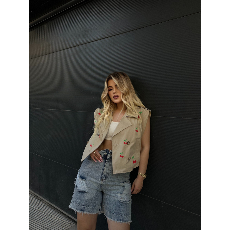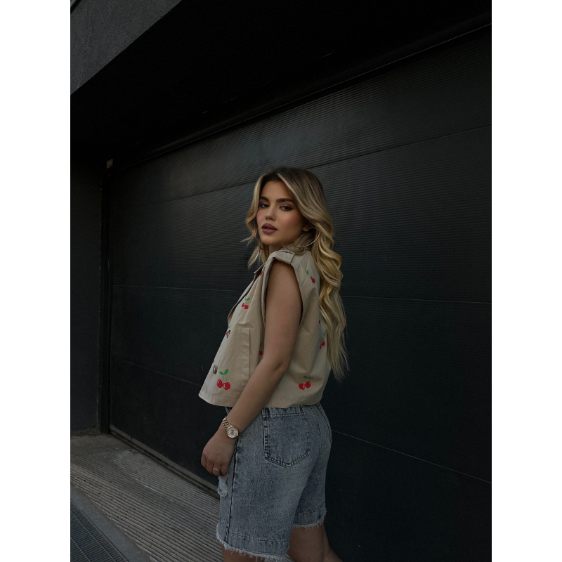 Jelek me qershi.Vjen me detajin e kopsave dhe xhepave ne pjesen para.Lehtesisht i kombinueshem me cdo veshje.