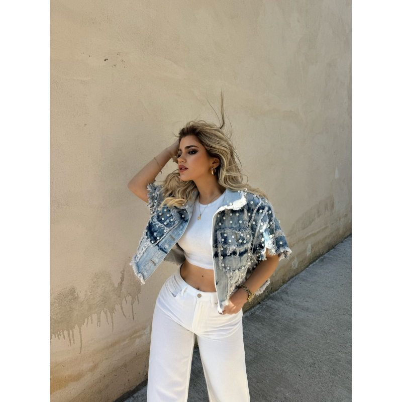 Jelek xhins me detaje me perla dhe yje. Vjen me xhepa para dhe eshte teper stil.