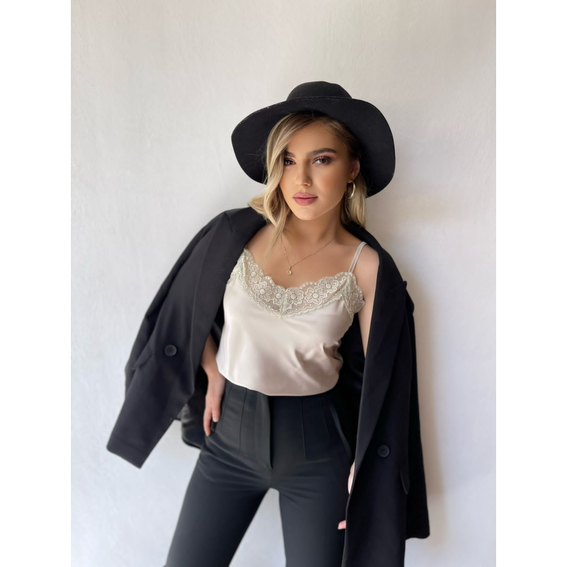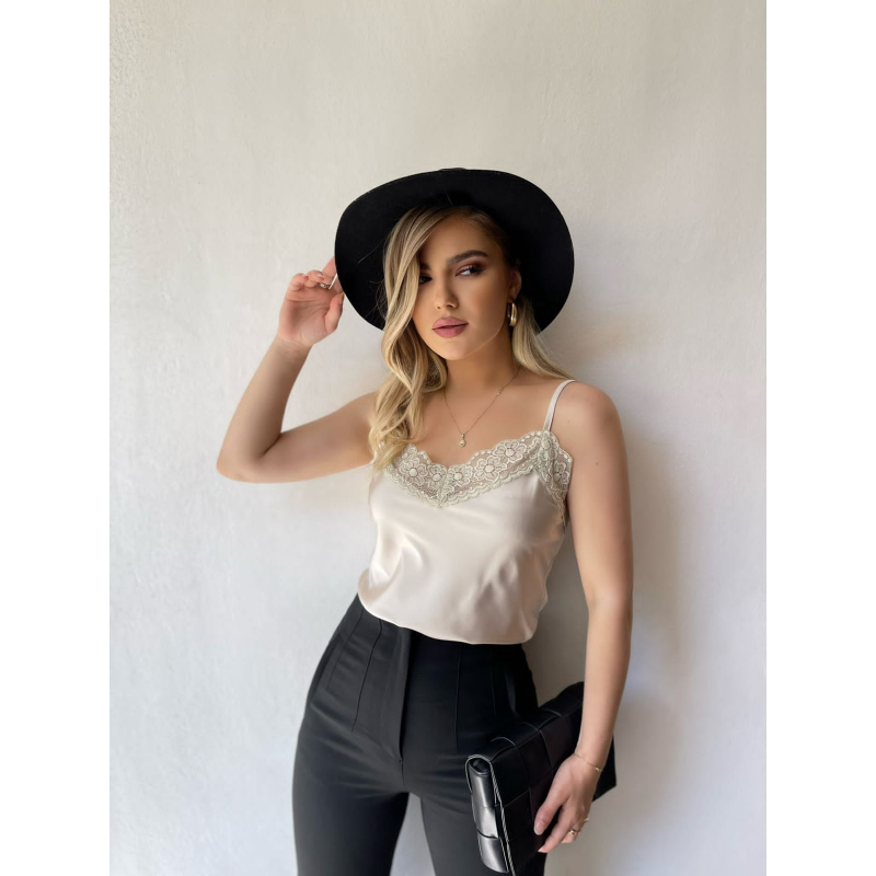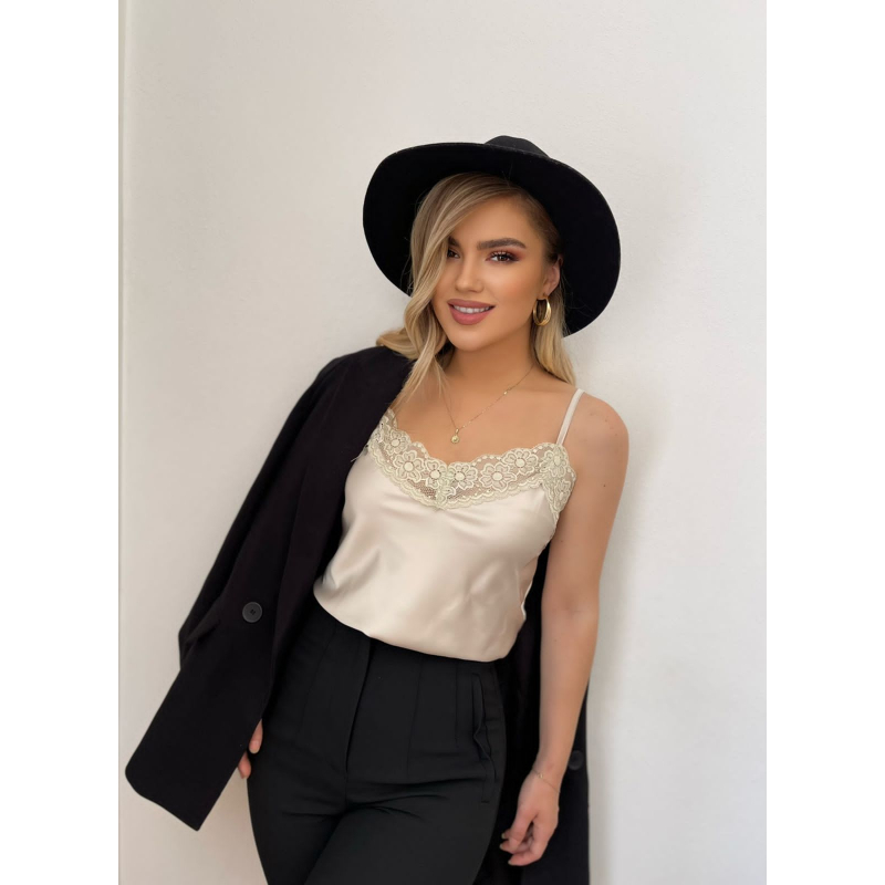 Kanatjere saten me rripa te holle te rregullueshem. Ne pjesen e dekoltes dhe ne pjesen fundore eshte me dantelle. Modeli vjene ne dy ngjyra: roze dhe bezhe.