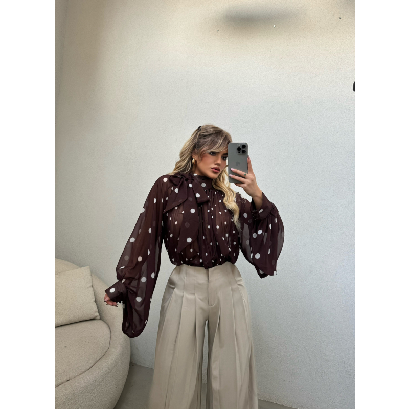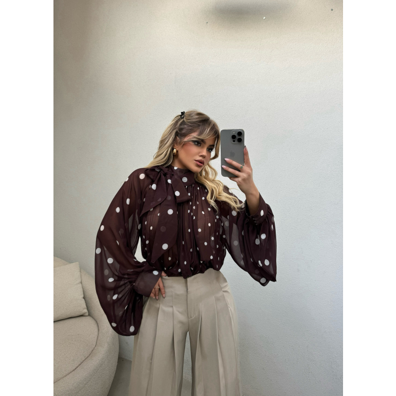 Kemishe ne ngjyren kafe me pika. Vjen me lidhje ne pjesen e qafes dhe pala ne pjesen e poshtme. Teper komode dhe praktike.