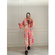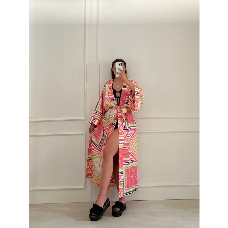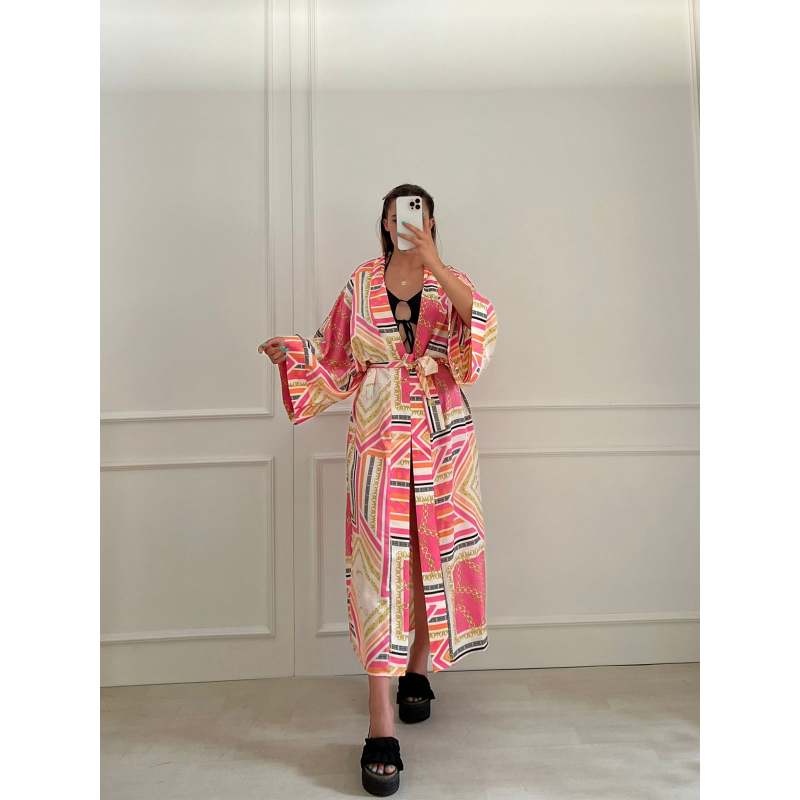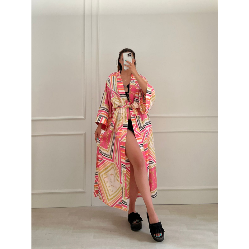 Kimono me nuanaca roze. Me krah te lirshme te gjere. Ka gjatesi mesatare. Mberthimi behet me lidhese ne pjesen e belit. Figurante dhe e bukur.