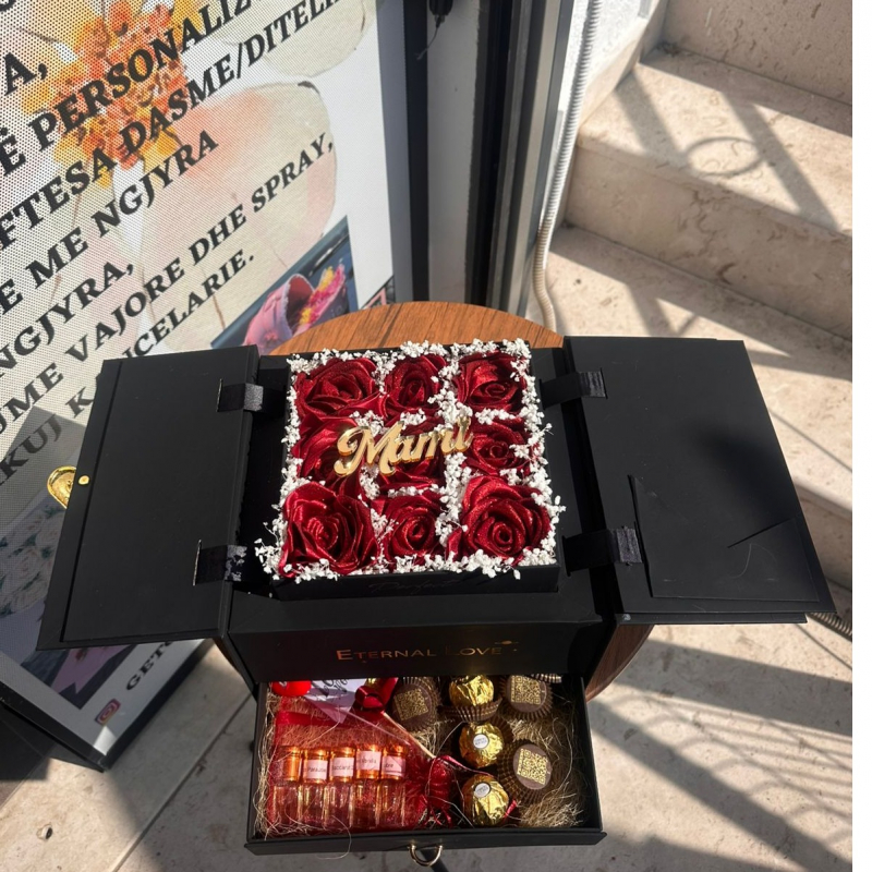 Kompozim ne kuti me lule sateni & parfum dhe cokollata