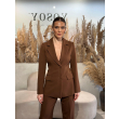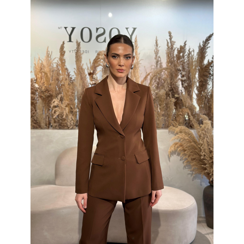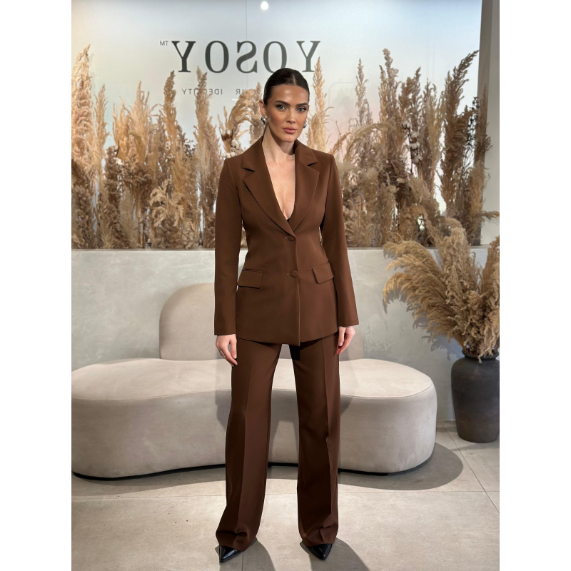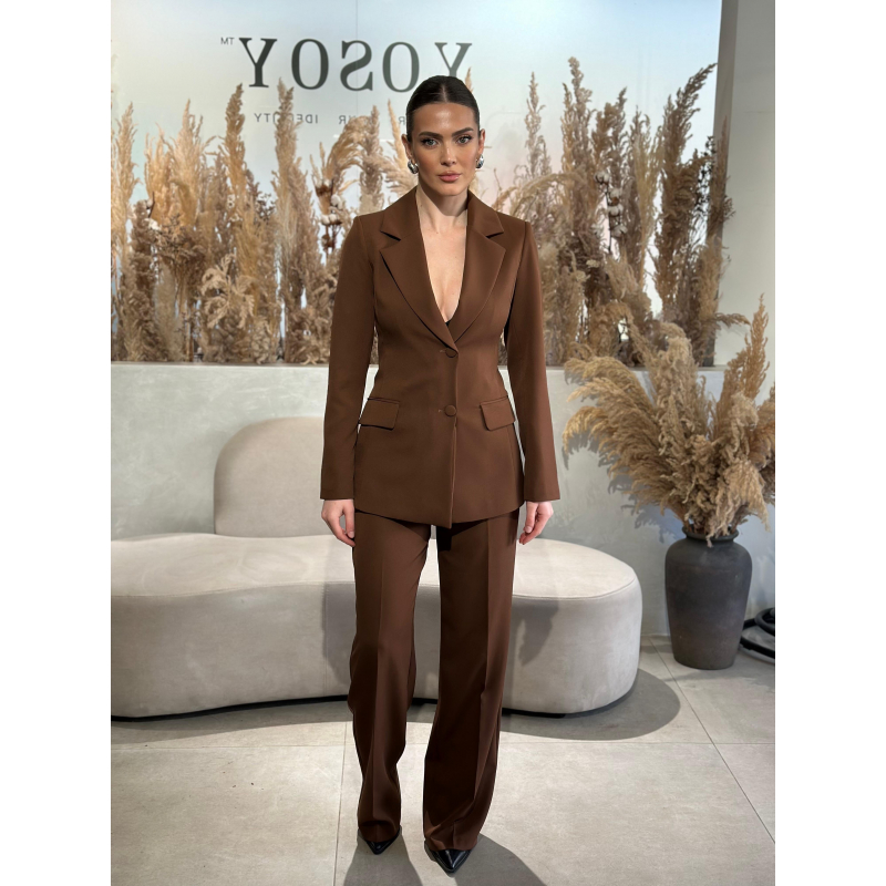 Kostum klasik me xhakete me bel dhe dy kopsa, e gjate deri ne mesin e vitheve. Pantallona te gjata te drejta me bel te larte dhe dy xhepa anesore.