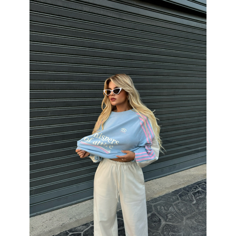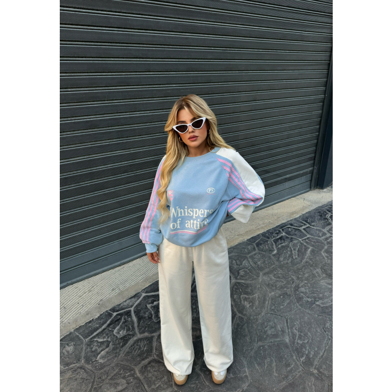 Kostum sportiv, material i bute. Prerje oversize, tutat vijne ne ngjyren e bardhe dhe bluza ne ngjyren bojeqielli. Shume praktik dhe i vecante.