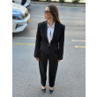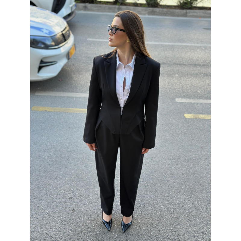 Kostum me xhakete te shkurter, te strukturuar sipas belit dhe me zgjatim te vogel perpara dhe pas. Jaka e xhaketes klasike dhe me kapese metalike te vogel te brendshme tek beli. Pantallonat me pensa perpara dhe pa xhepa.
