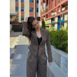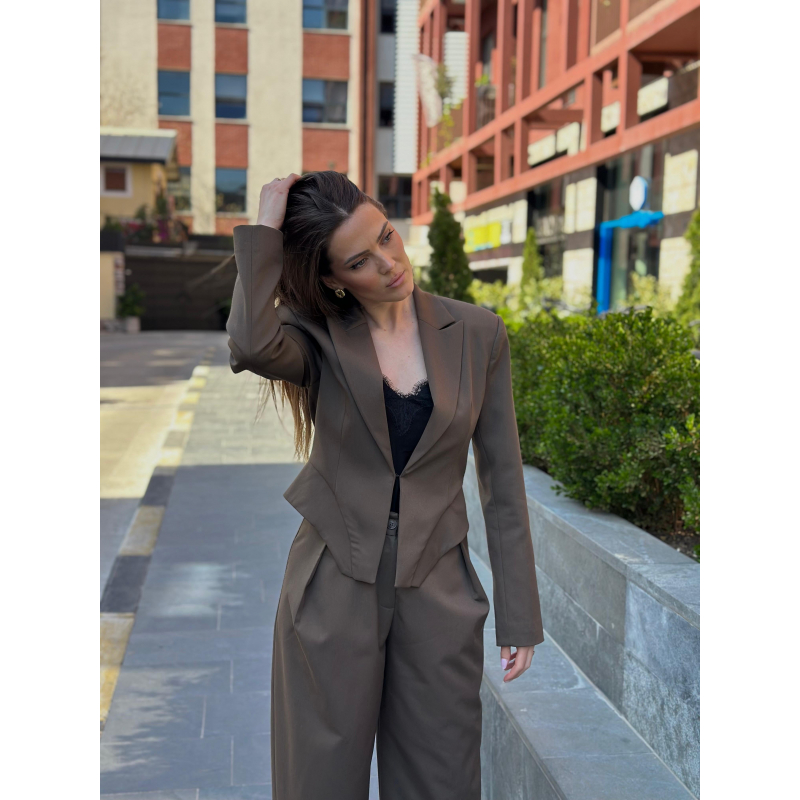 Kostum me xhakete te shkurter, te strukturuar sipas belit dhe me zgjatim te vogel perpara dhe pas. Jaka e xhaketes klasike dhe me kapese metalike te vogel te brendshme tek beli. Pantallonat me pensa perpara dhe pa xhepa.