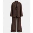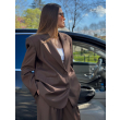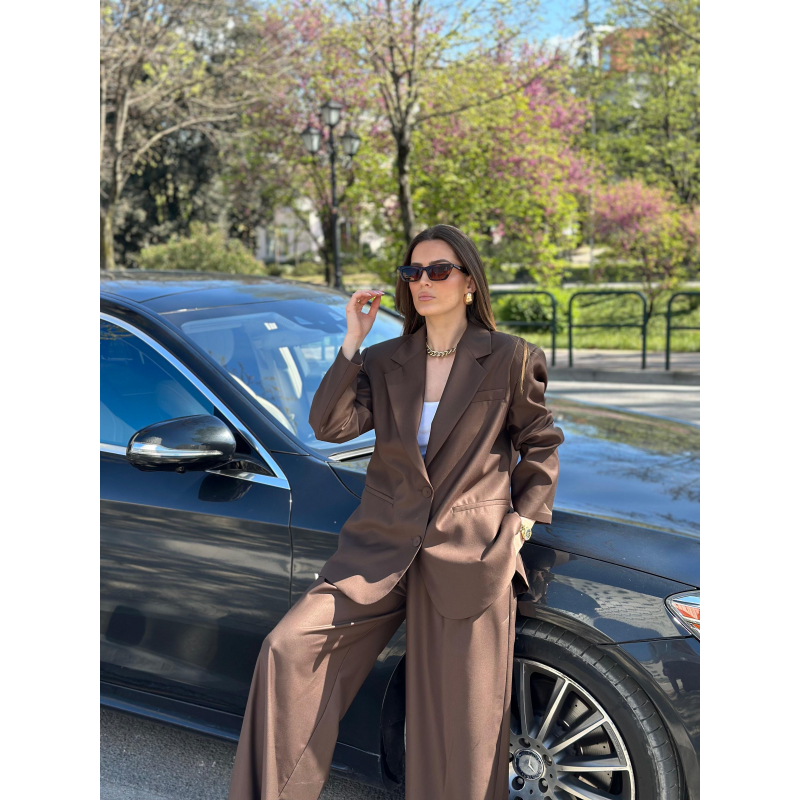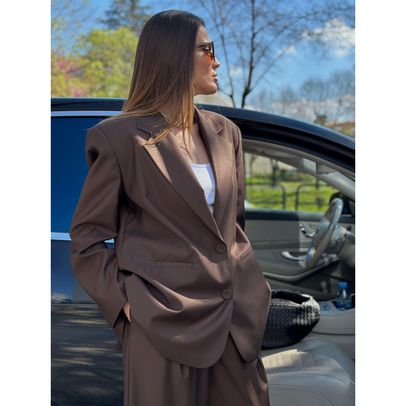 Kostum oversize per femra. Cilesia premium. Xhaketa me supe te medha oversize dhe e gjere. Pantallonat stil i gjere me pensa perpara dhe xhepa anash.