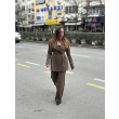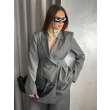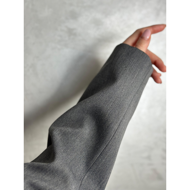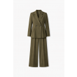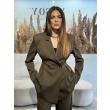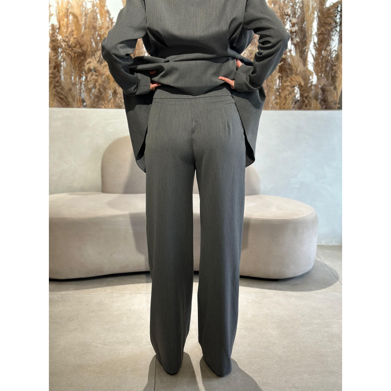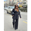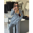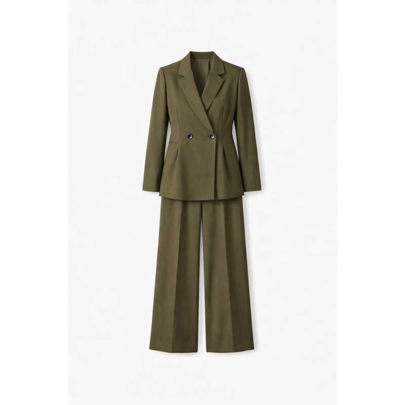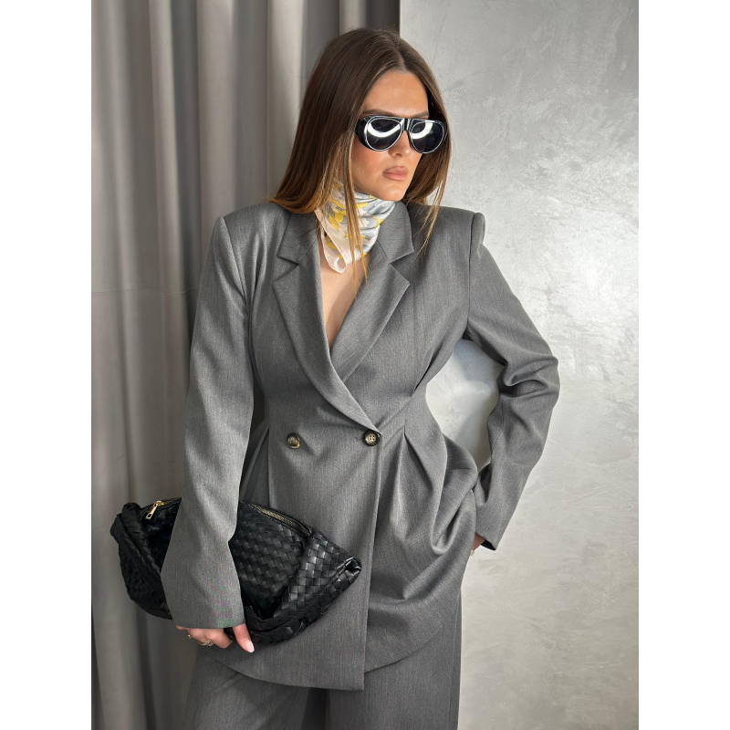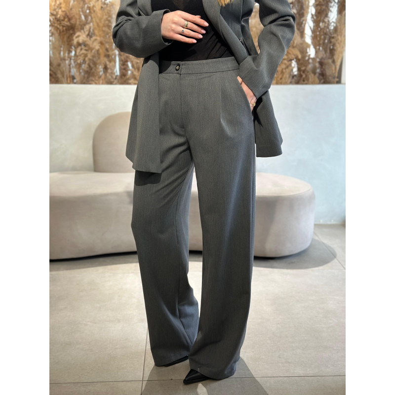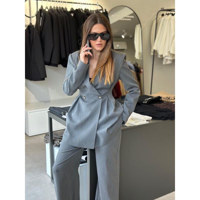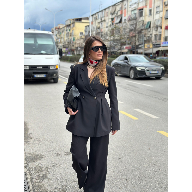 Kostum me xhakete me bel, me dy kopsa dhe pensa me pale perpara. Pantallona te gjera.