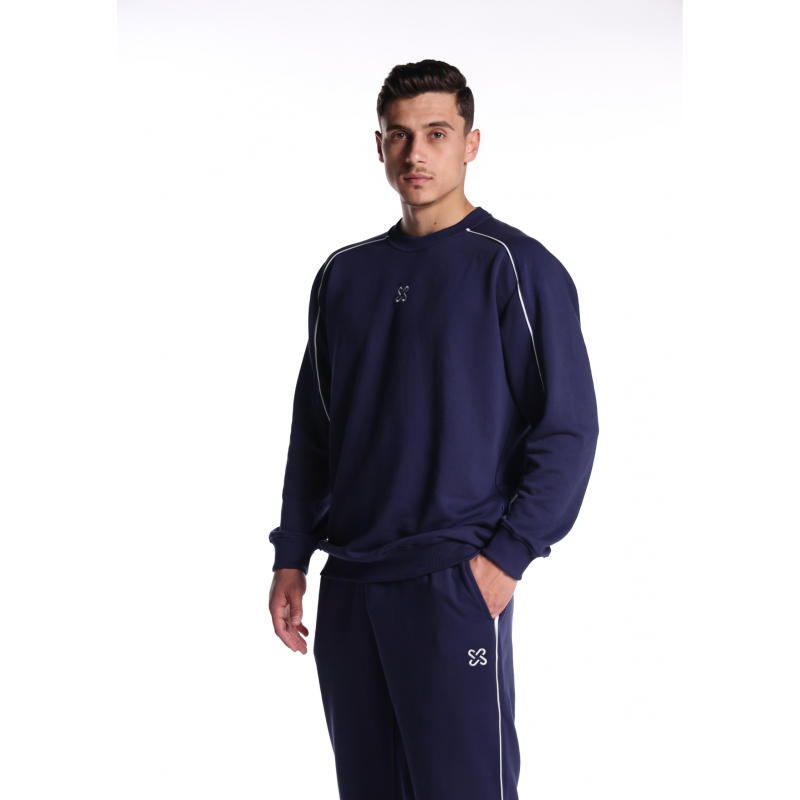 A fresh essential from our SS'25 men's lineup. Crafted from ultra-soft cotton blend fabric, this navy crewneck delivers all-day comfort with a clean, athletic edge. The white piping along the sleeves adds a dynamic contrast, while the embroidered cross logo at the chest keeps it sleek and understated.