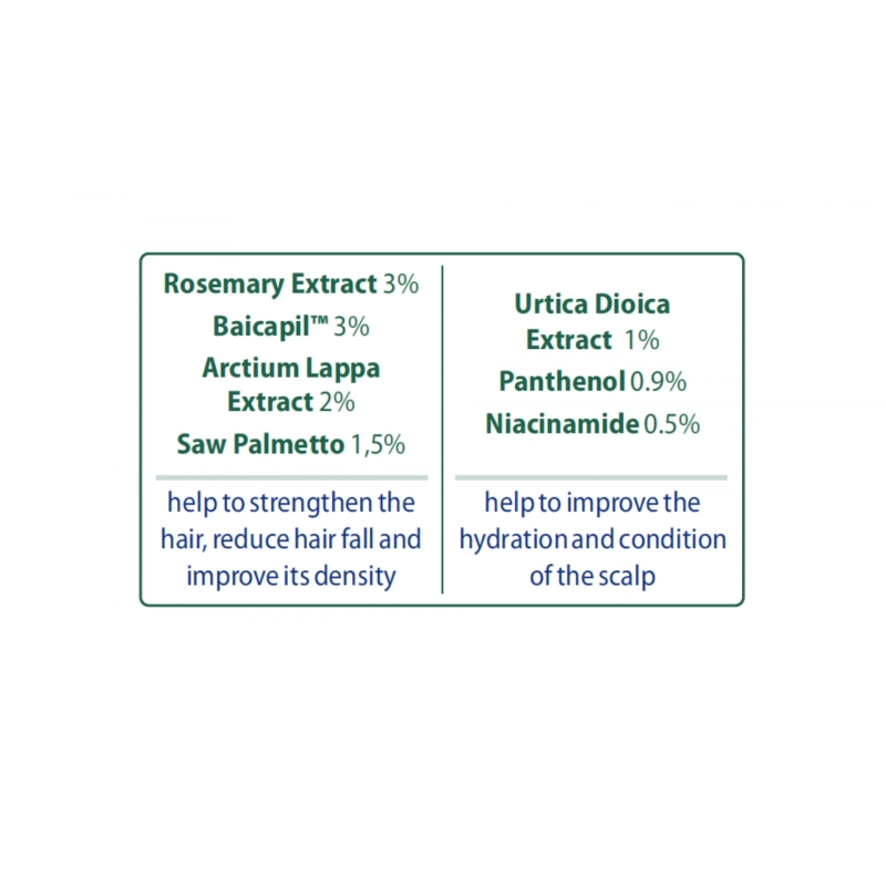 Panthenol, Niacinamide, Ekstrakt Hithër - hidratojne ,qetesojne dhe kujdesen për gjendjen e scalpit.