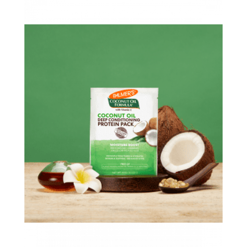 Menjëherë pas shampos me Shampo Palmer's Formula me vaj kokosi, aplikojeni paketën e proteinave me bollëk dhe trajtojeni flokët nga rrënja në majë dhe lëreni të depërtojë deri në 5 minuta. Shpëlajeni tërësisht.