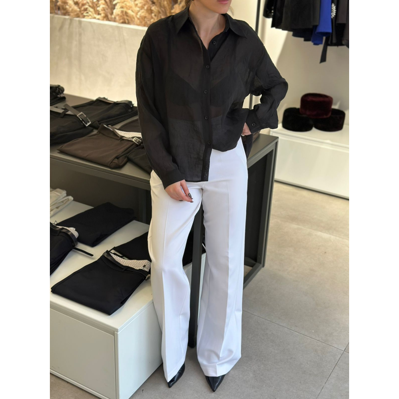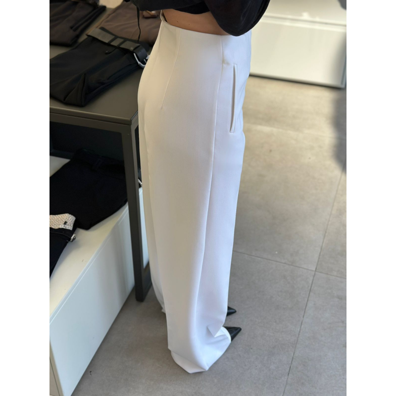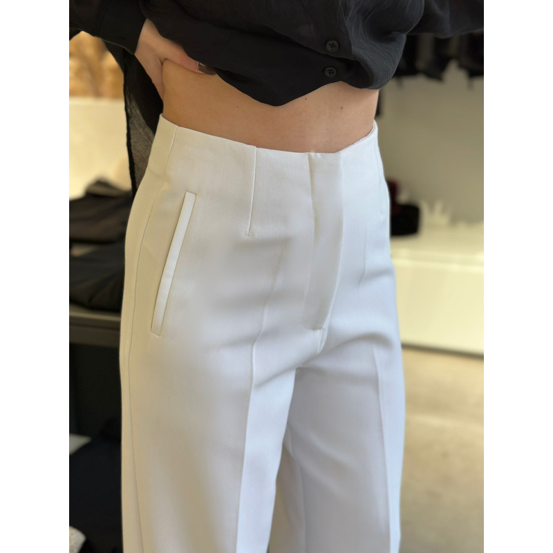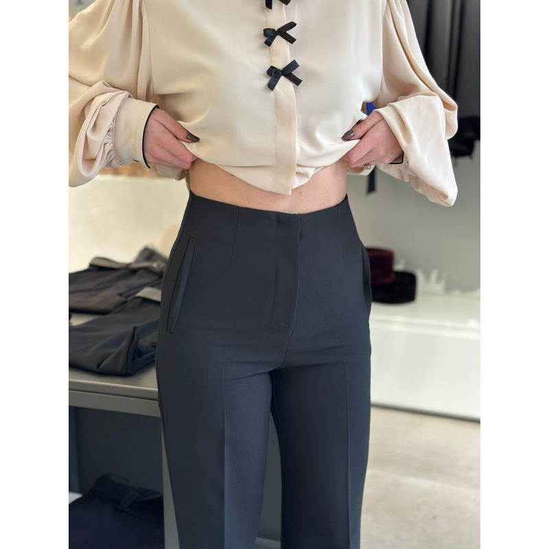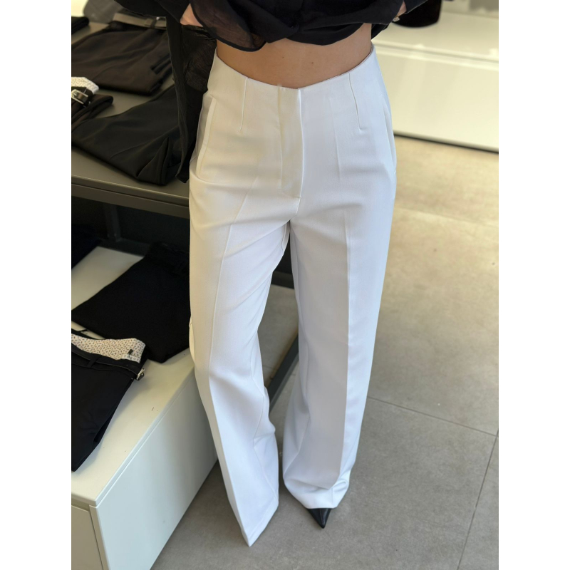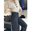 Pantallona stil paralel te gjata me bel te larte. Dy pensa perpara dhe pas, si dhe kopse me zinxhir te mbuluar. 2 xhepa anesore.