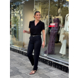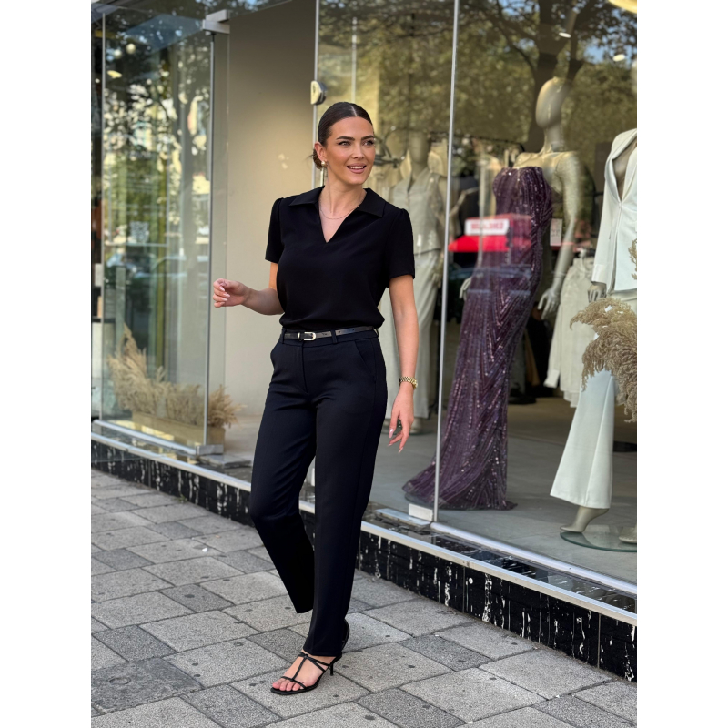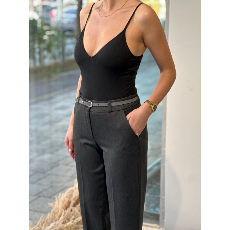 Pantallona klasike kaush, pas trupi per te dhene siluete elegante. 2 xhepa funksionale anesore dhe 2 xhepa fallso nga pas. Shoqerohen me nje rrip te holle te zi.