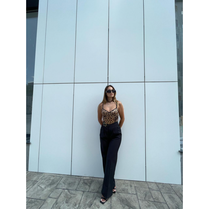Pantallona te zeza me rrip me togez me gure. Pantallona te gjata me bel te larte. Me xhepa te bollshem. Mberthimi behet me zinxhir dhe kops ne pjesen e perparme.