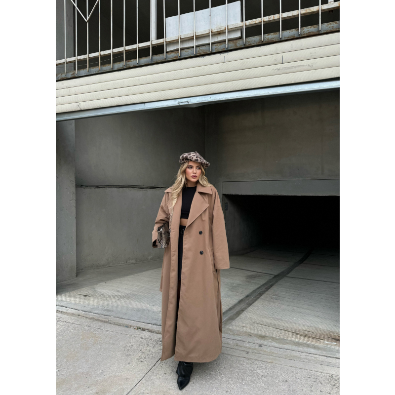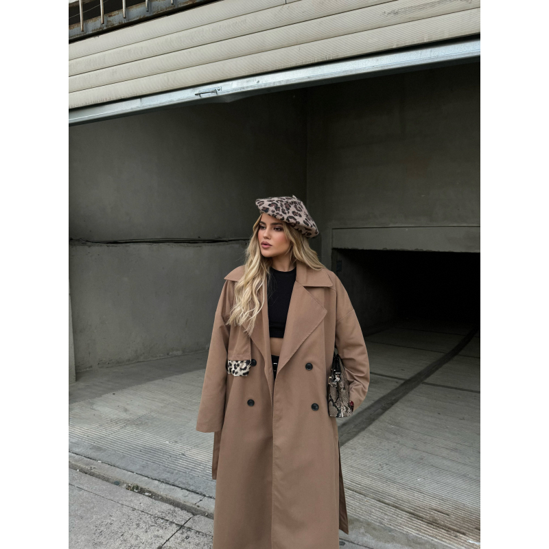 Pardesy e gjate oversize me rrip ne bel. Eshte me pjese leopardi. Me dopio kopse perpara. Me astar me motive leopardi nga brenda.