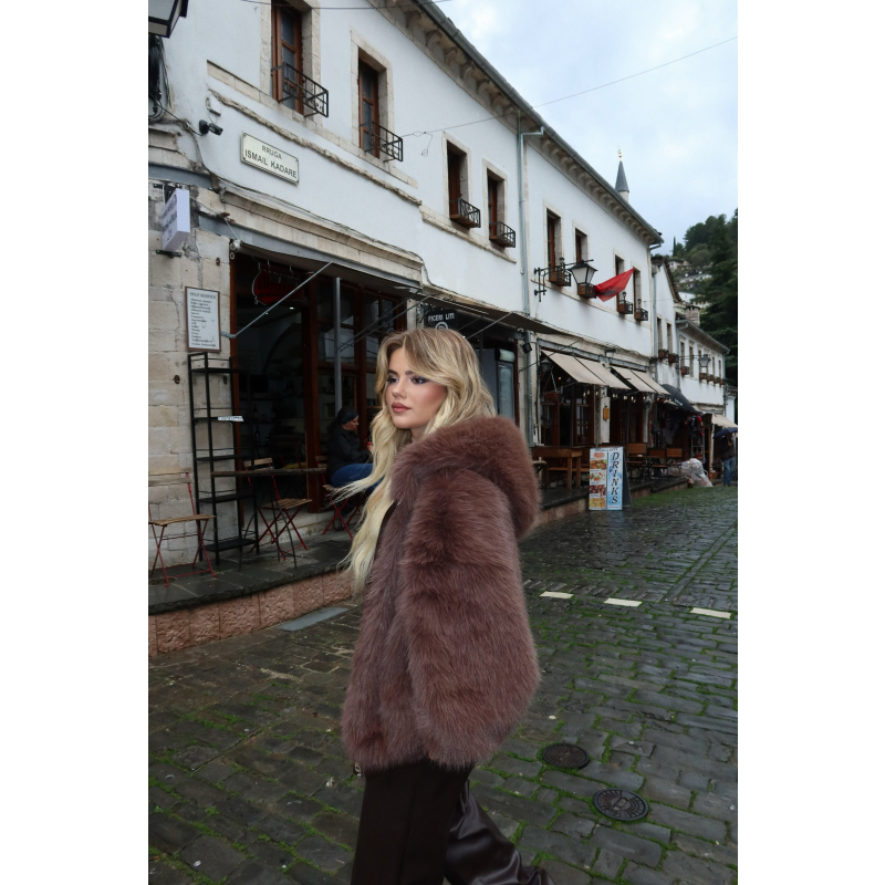Pellush i shkurter ne ngjyren kafe, eshte me zinxhire dhe kapuce. Ideal per tu dukur stil dhe e vecante