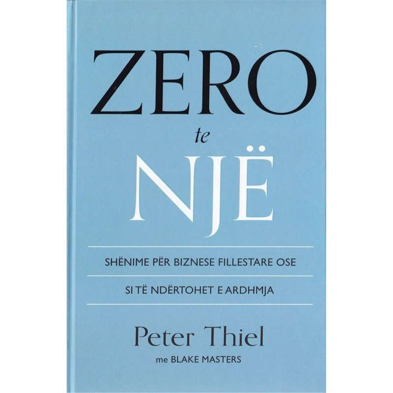Cdo herë që krijojmë diçka të re, ne kalojmë nga 0 te 1. Veprimi i krijimit është i veçantë, siç është edhe momenti i krijimit, dhe rezultati eshtë diçka e re dhe e pazakontë. Ky libër është se si të arrijmë atje. "Kur një rrezikues shkruan një Iibër, lexoje. Në rastin e Peter Thiel, lexoje dy herë. Ose, për të qenë i sigurt, tri herë. Eshtë klasik." - NASSIM NICHOLASTALEB, autor i "Mjellma e zezë”. "Ky libër paraqet ide tërësisht të reja dhe përtëritëse në krijimin e vlerës në botë." - MARK ZUCKERBERG, CEO i Facebook. "Peter Thiel ka ndërtuar kompani të shumta depërtuese, dhe "Zero te Një” tregon si." - ELON MUSK, CEO i SpaceX dheTesla.