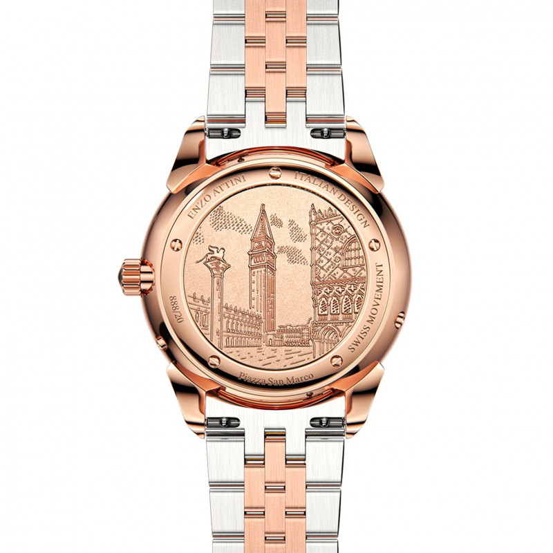 • Kasa: Stainless steel 316L, ngjyrë rose gold (e larë me ar të vërtetë 18 karat), përmasat: 40mm x 8.9mm.