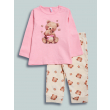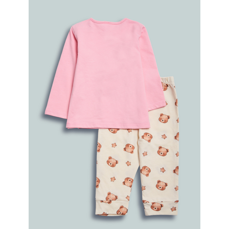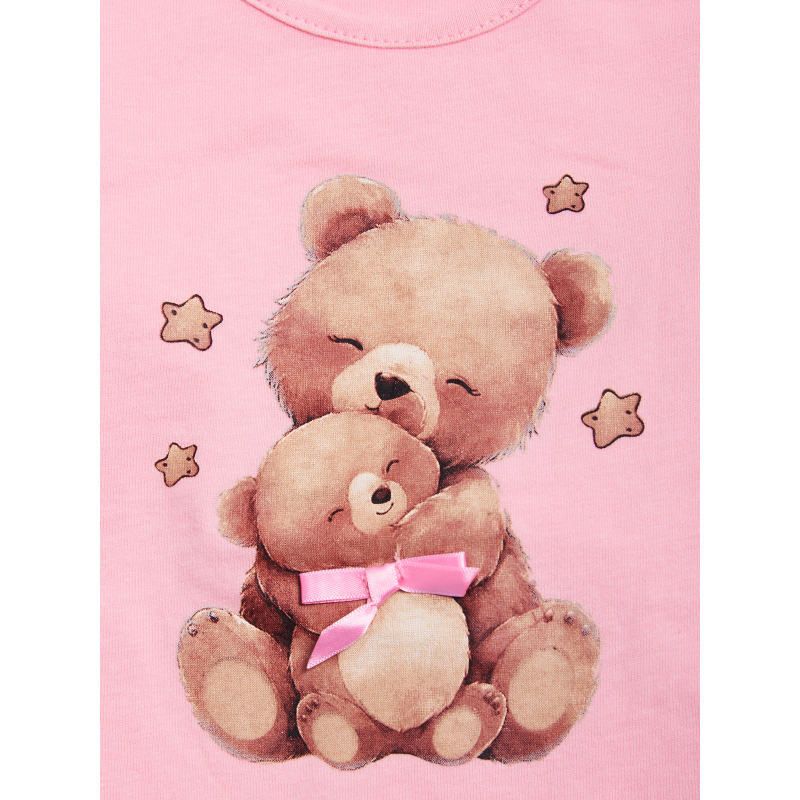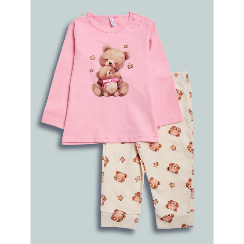 Pigiama due pezzi in cotone. Tshirt manica lunga con pratica apertura sulla spalla grazie ai bottoncini a pressione. Tenera stampa orsetto con fiocchetto tridimensionale. Pantaloni basic in fantasia orsetto. Vita elasticata per maggiore comodità. Un pigiama perfetto, morbido e confortevole, ideale per fare dolci sogni!