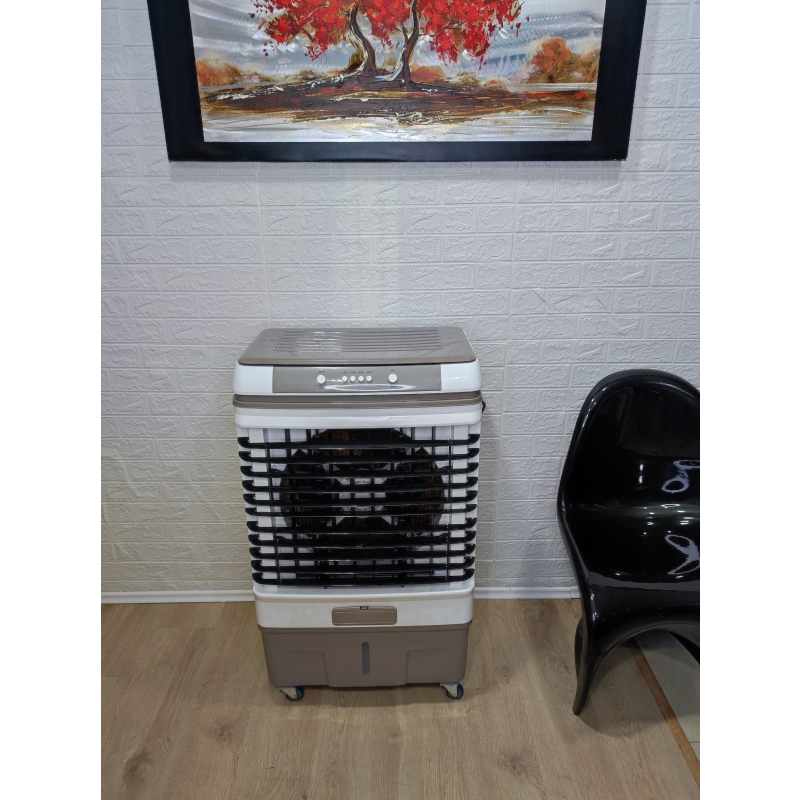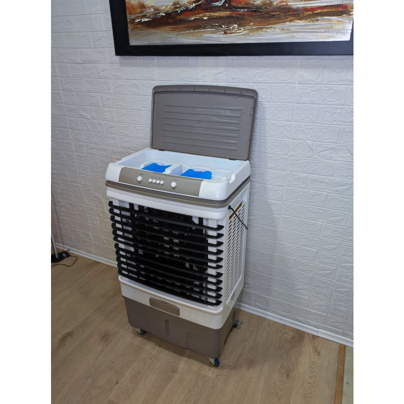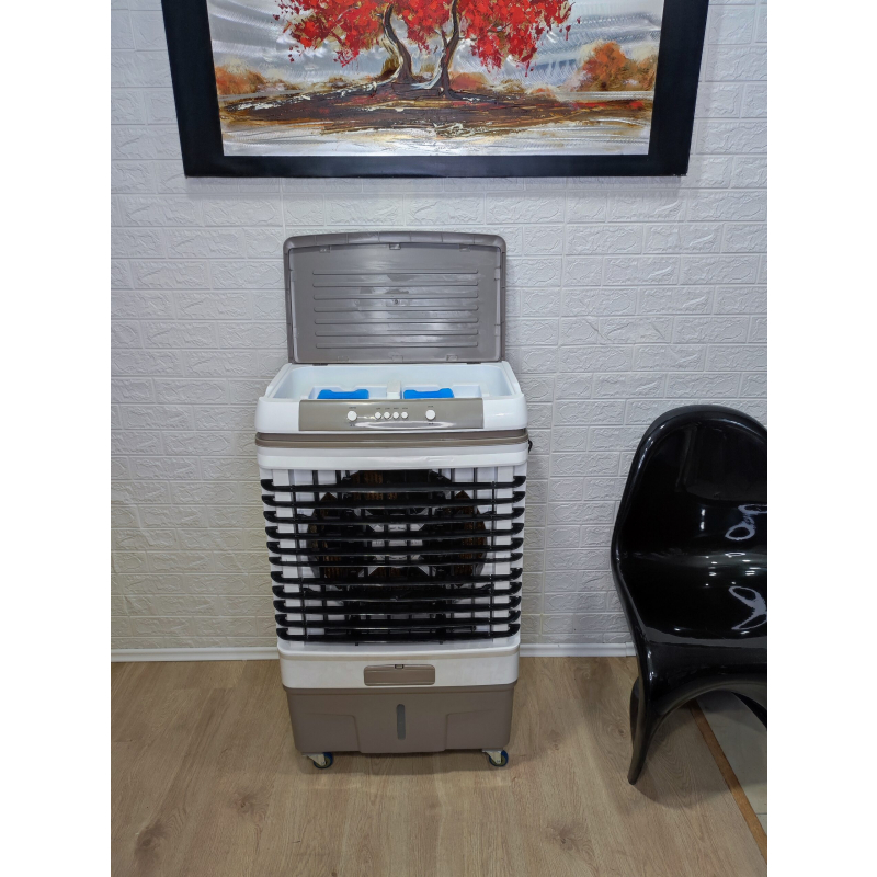 Air Cooler Freskues Portabel 50L 350w Professional gjatë procesit të ftohjes konsumon vetem 350W, ena 50 litroshe e ujit+akull (në se doni) siguron ajër të fresket, mjaftueshëm për një sipërfaqe salloni të madh 30-40m2.