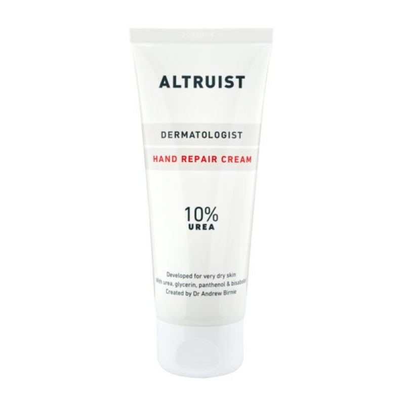 Altruist Hand Repair Cream 10% UREA është një krem per duart për kujdes intensiv të përditshëm. Produkti është krijuar nga dermatologu Dr Andrew Birnie për lëkurë të stresuar dhe të thatë. Larjet e shpeshta dhe faktorët mjedisorë mund të ndikojnë në rehatinë e duarve. Formula është e përqendruar, por mbetet e lehtë dhe praktike për përdorim të shpeshtë. Urea ndihmon në mbajtjen e lagështisë dhe zbutjen e sipërfaqes së lëkurës. Glicerina kontribuon në hidratimin dhe ndjesinë e butësisë së duarve. Panthenoli ndihmon në qetësimin e ndjesisë së parehatshme të lëkurës. Bisabololi ndihmon në qetësimin e pamjes së irritimit dhe skuqjes.