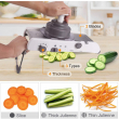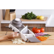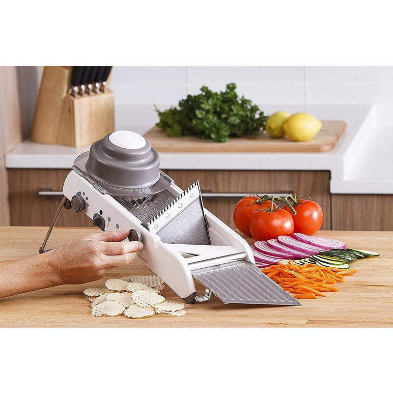 Kjo prerëse, tip mandoline, bën gjithçka që dëshironi të bëni: prerje të drejta, prerje të sheshta dhe me onde, prerje të vogla julienne dhe prerje më të mëdha fetash ose kubikësh. Në total ka 18 prerje të ndryshme që variojnë nga 1mm deri në 7mm trashësi.