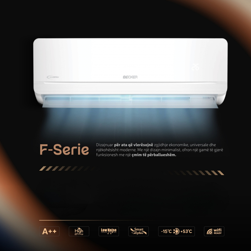 Kondicioner BECKER F Serie 18.000-BTU është krijuar për ata që kërkojnë një kondicioner funksional, të besueshëm dhe ekonomik, pa kompromis në performancë. Me teknologji Inverter dhe gaz R32, ky model ofron kursim energjie, funksionim të qetë dhe jetëgjatësi, duke e bërë ideal për përdorim të përditshëm në shtëpi apo zyrë.