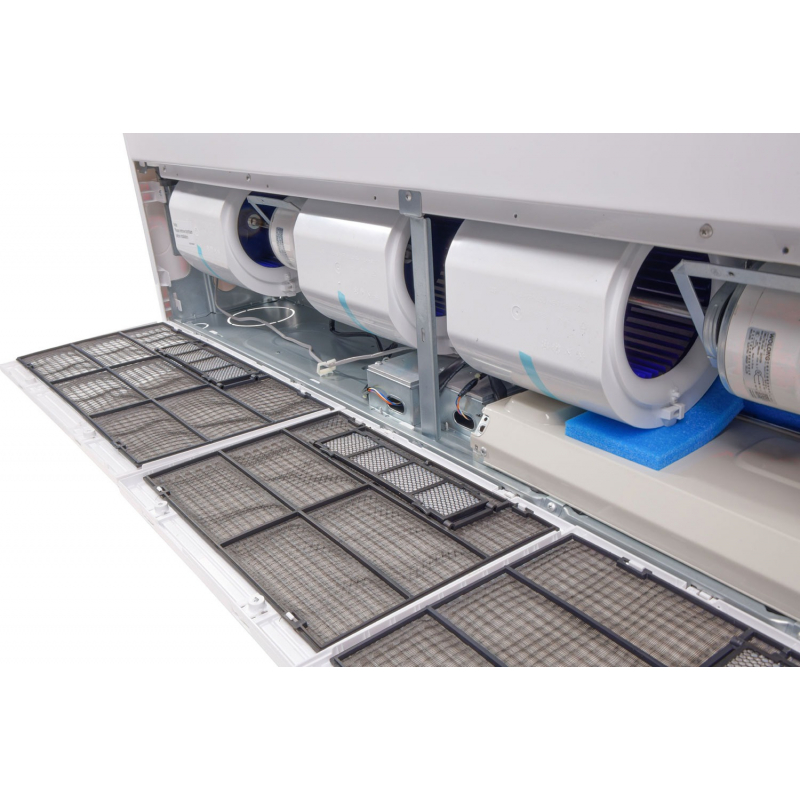 Njësia e brendshme ofron rrjedhë ajri shumë të fuqishme deri në 2200 m³/h, duke shpërndarë ajrin shpejt dhe në mënyrë të njëtrajtshme në gjithë ambientin. Niveli i zhurmës është i menaxhuar për ambiente profesionale, duke ruajtur komoditetin edhe gjatë funksionimit të vazhdueshëm.