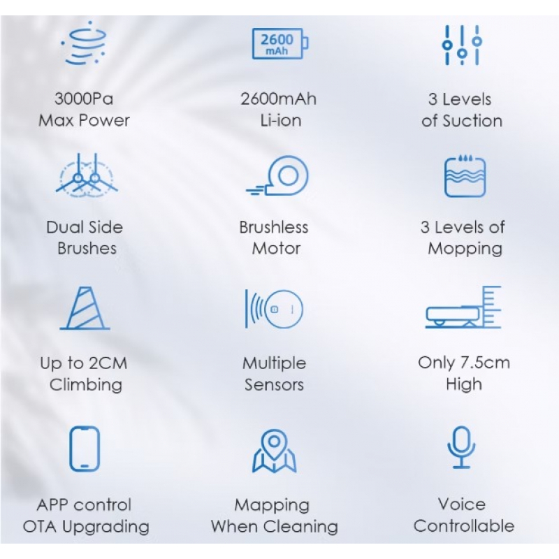 Depozita e ujit është 270 ml dhe e lehtë për t’u mbushur ose pastruar. Motorri brushless siguron efikasitet energjie dhe jetëgjatësi të gjatë. Roboti rikthehet vetë në stacionin e karikimit kur bateria është e ulët.