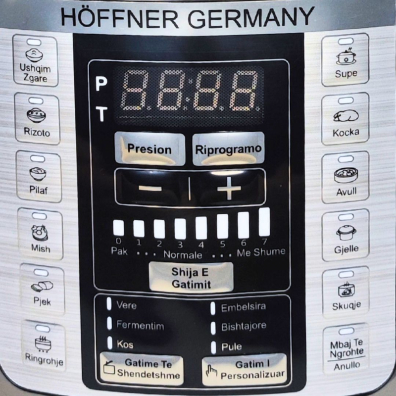 Zbuloni Multikuker HÖFFNER GERMANY 6L – një pajisje multifunksionale me komandë të plotë në gjuhën shqipe, krijuar për të thjeshtuar çdo recetë në kuzhinën tuaj. Me një fuqi prej 1000W dhe kapacitet 6 litra, ky multicooker përballon me lehtësi supe, mish, rizoto, embëlsira, gjellë tradicionale, madje edhe kos dhe pjekje të ngadalta.