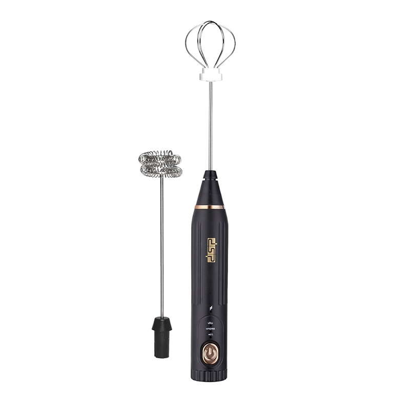 Perzieres kafeje mikser rrahse veze e ringarkueshme dhe shkumëzues qumështi 2 në 1 nga DSP. Dizajni ergonomik dhe performanca e lartë që ofron komoditet absolut të përdorimit brenda dhe jashtë shtëpisë pasi funksionon me bateri dhe karikohet me një kabllo të thjeshtë USB. Ka bateri Litiumi te cilat mbajne per nje kohe relativisht te gjate dhe nuk shkarikoen kur pajisja rri pa punuar. Ka 2 koka përzierëse të këmbyeshme për çdo nevojë. Ju mund te rrihni frapene ose te beni krem qumeshti me njeren koke. Koka e dyte sherben per te rrahur vezet. Pajisja ka 3 nivele shpejtesie, te ulet per vezet, te mesem per kafe dhe te larte per qumeshtin.