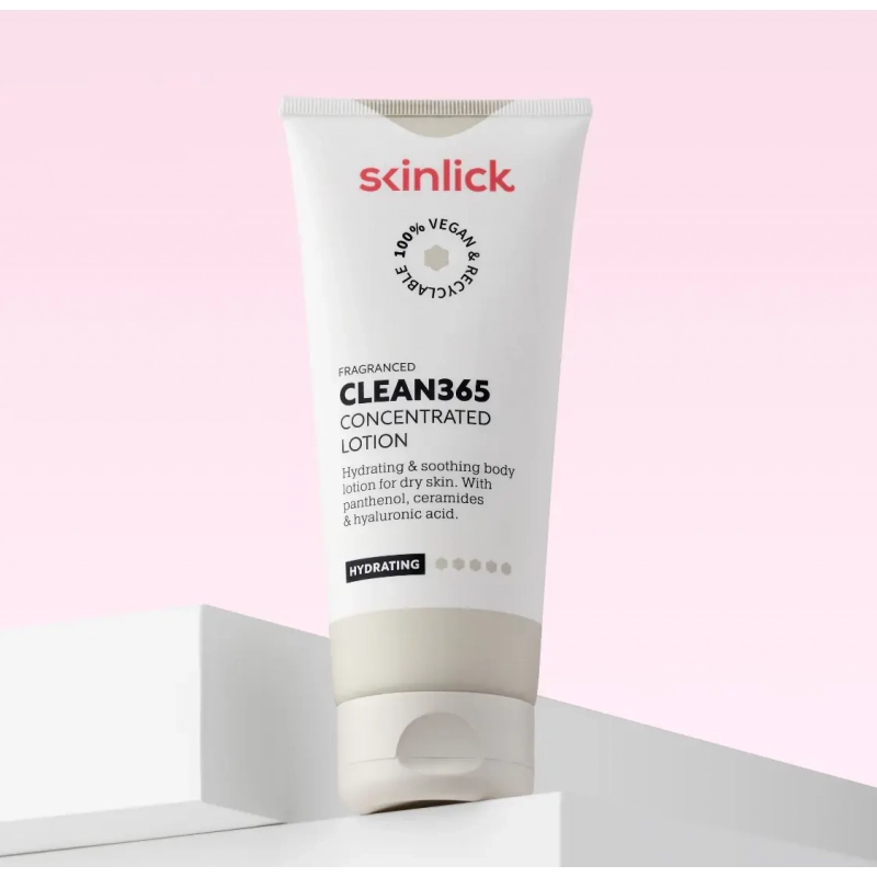 Skinlick CLEAN365 Concentrated Lotion është një losion trupi për përdorim të përditshëm me mbi 94% përbërës me origjinë natyrale, i cili i rikthen lëkurës butësinë, elasticitetin dhe shkëlqimin e shëndetshëm. Me teksturë të lehtë dhe aromë të pastër, pudër, ofron hidratim pa lënë ndjesi yndyre – lëkurë e pastër, aromatike dhe e butë, çdo ditë.