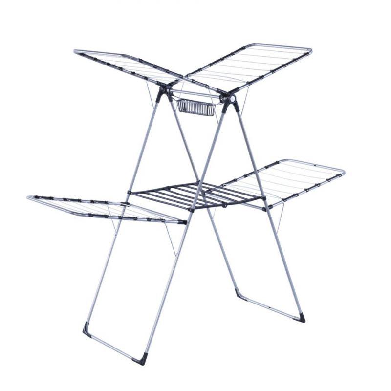 E ndërtuar me strukturë metalike me tuba Ø16 mm dhe e lyer me bojë pluhur elektrostatike, ajo ofron rezistencë ndaj lagështirës, ndryshkut dhe konsumit të përditshëm. Falë dizajnit të saj vertikal me disa nivele dhe krahë të hapshëm, kjo tharëse është perfekte për ballkone, tarraca ose ambiente të brendshme ku kërkohet efikasitet maksimal pa zënë shumë vend.